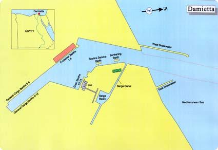 Damietta Port is situated 8.5 km. west of the Nile estuary of Damietta branch westward Ras El-Bar, and it is 70 km. distanced from Port Said Port. The port installations extend on an area of 25 sq. Km. The port is bordered by an imaginary line connecting the eastern and western external breakwaters.